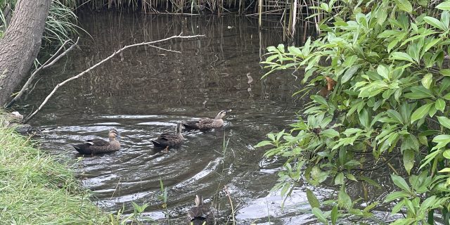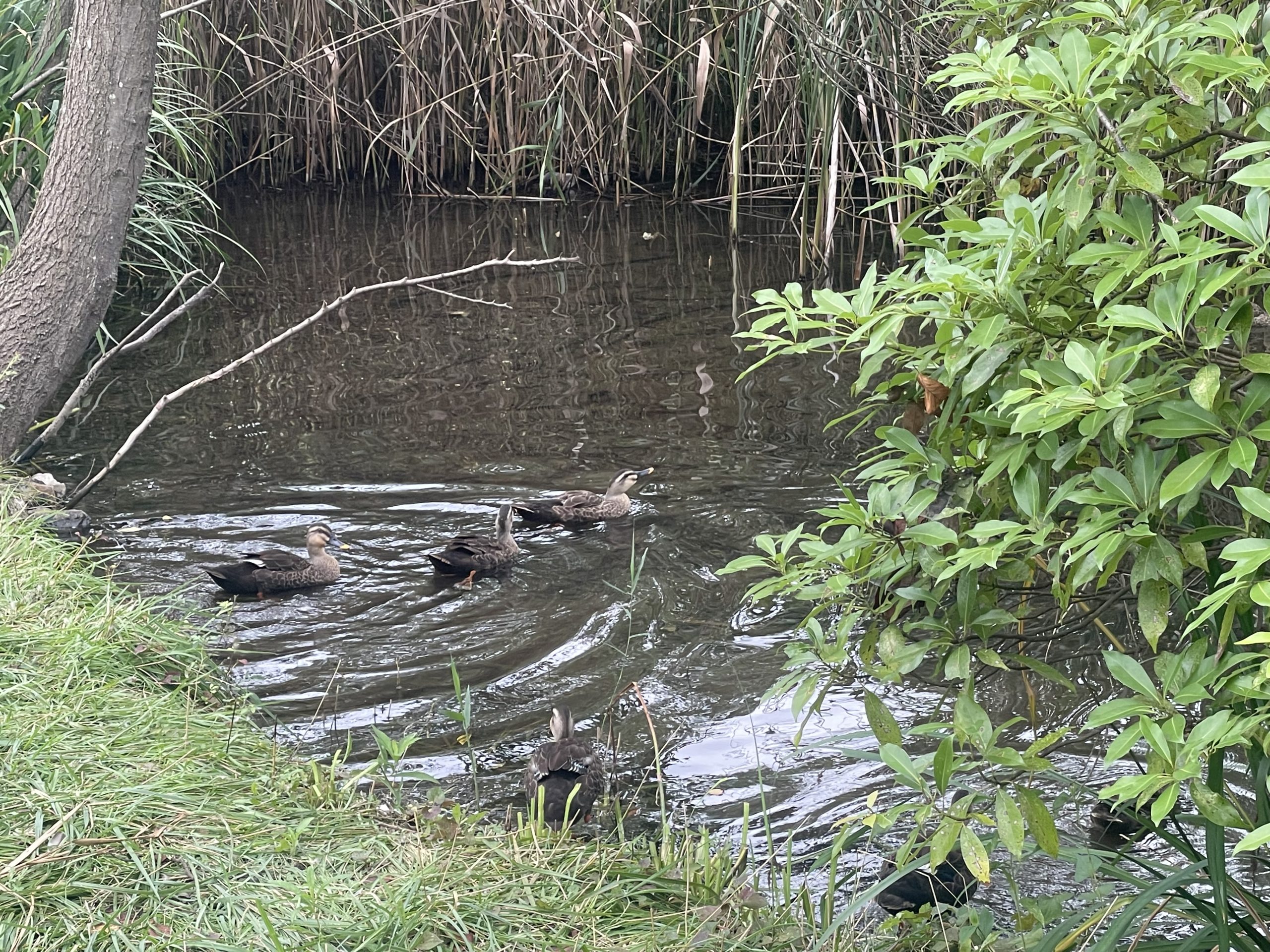 のんびりとしてる鴨の群れ 先頭の子の伸びがのんびりとしてる空間を感じられるそんな一枚です